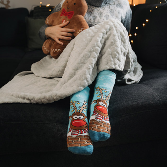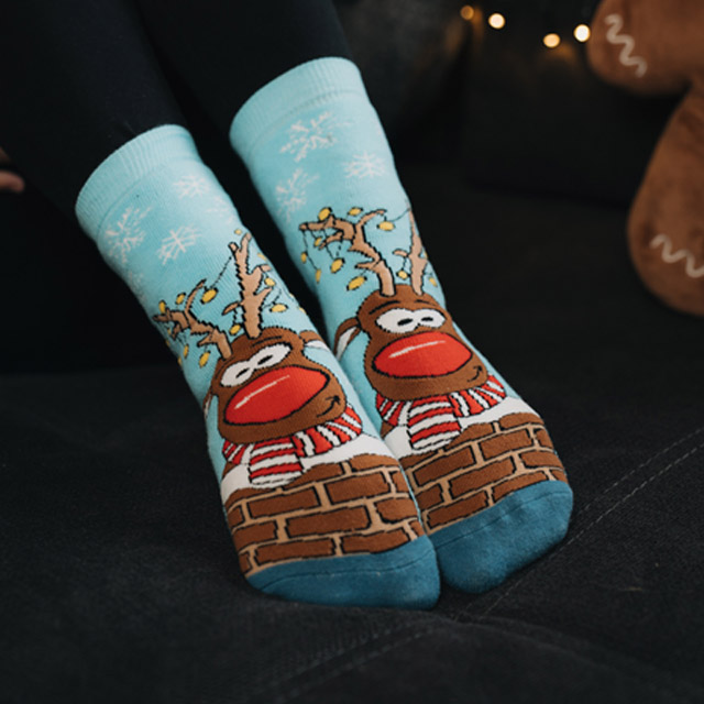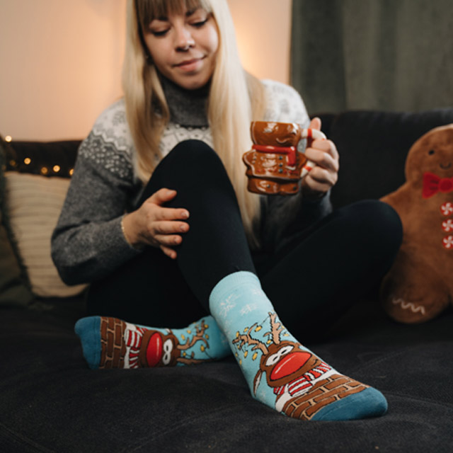 S veselým sobem na vašich nohách se každý krok stává zábavou. Vzory inspirované zimními radovánkami vykouzlí úsměv nejen vám, ale i každému, kdo je uvidí.