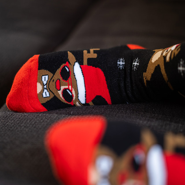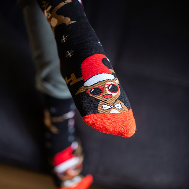 S veselým sobem na vašich nohách se každý krok stává zábavou. Vzory inspirované zimními radovánkami vykouzlí úsměv nejen vám, ale i každému, kdo je uvidí.